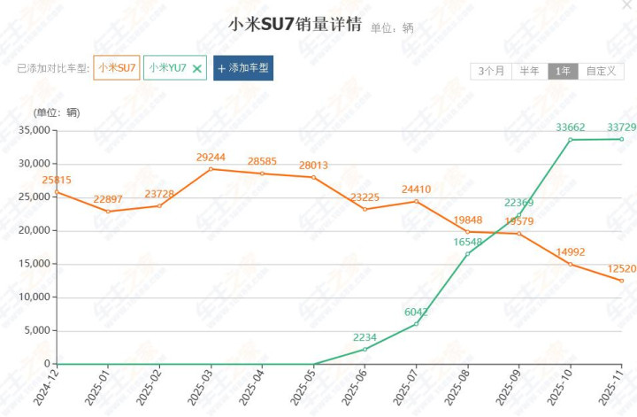 如下图所示,这是最近一年以来,小米SU7、YU7的销量变化图,可以看到小米YU7自7月份开启交付以来,节节高,到11月份时,已经达到了3.37万辆。