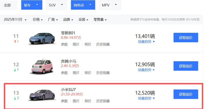 在纯电轿车的排行中,9月份时,小米SU7能排在第7名,10月份时降至第10名,11月份降至13名,也是连前10名都保不住了。
